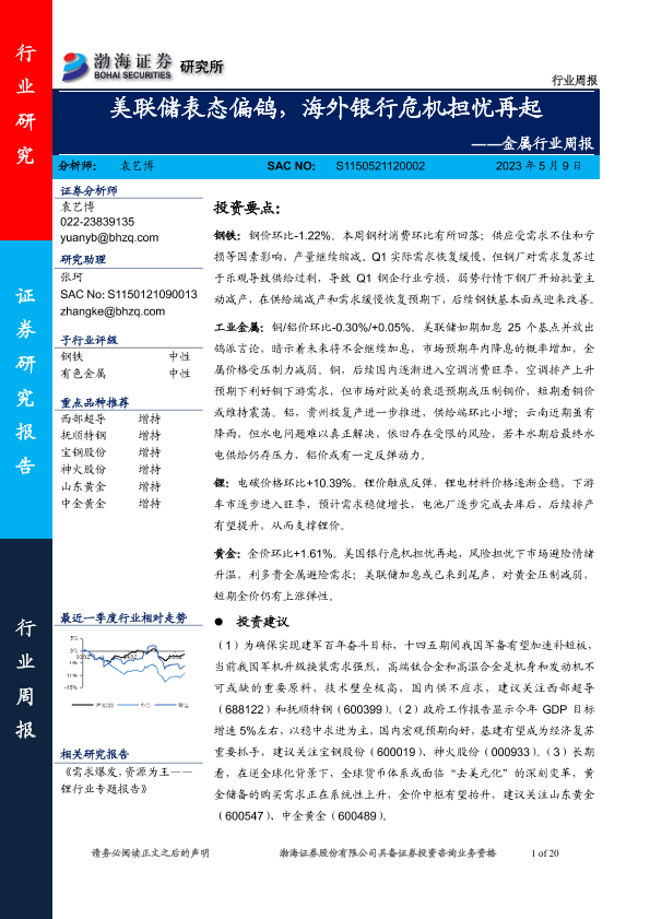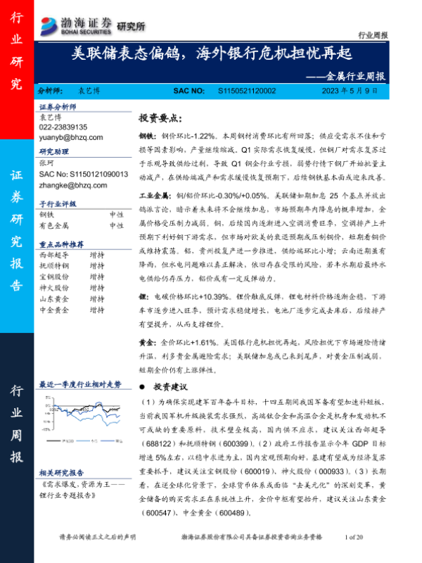 【渤海证券】【20230509】20230509-渤海证券-金属行业周报:美联储表态偏鸽,海外银行危机担忧再起-20页