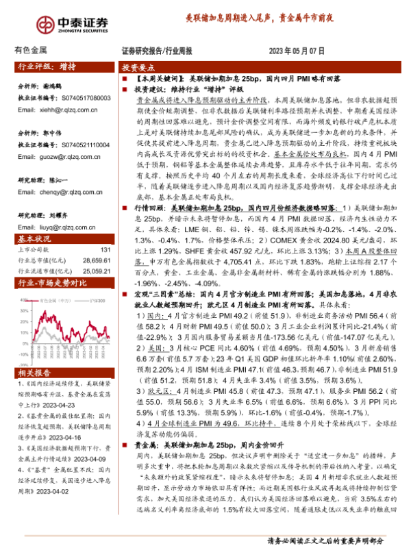 【中泰证券】【20230507】中泰证券-有色金属行业周报:美联储加息周期进入尾声,贵金属牛市前夜-34页