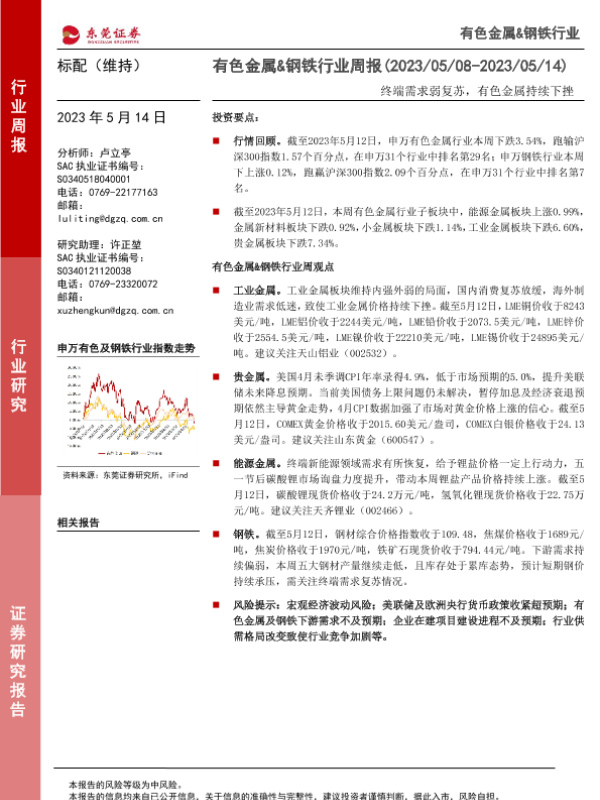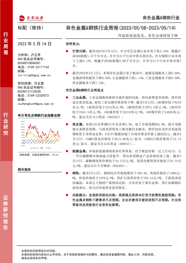 【东莞证券】【20230514】20230514-东莞证券-有色金属&钢铁行业周报:终端需求弱复苏,有色金属持续下挫-12页