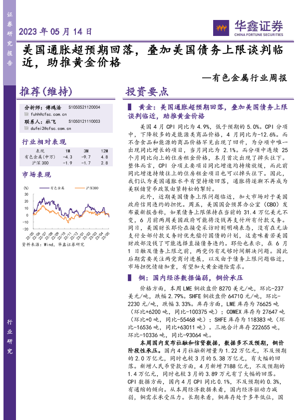 【华鑫证券】【20230514】20230514-华鑫证券-有色金属行业周报:美国通胀超预期回落,叠加美国债务上限谈判临近,助推黄金价格-14页