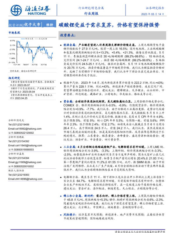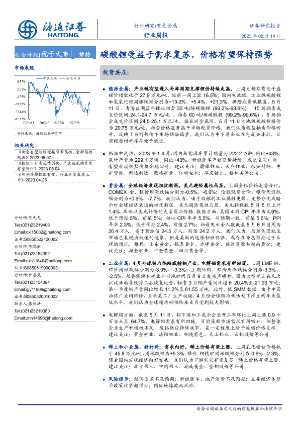 【海通证券】【20230514】20230514-海通证券-有色金属行业周报:碳酸锂受益于需求复苏,价格有望保持强势-14页