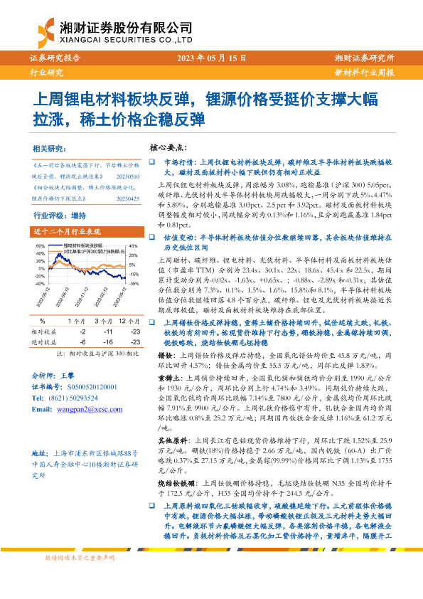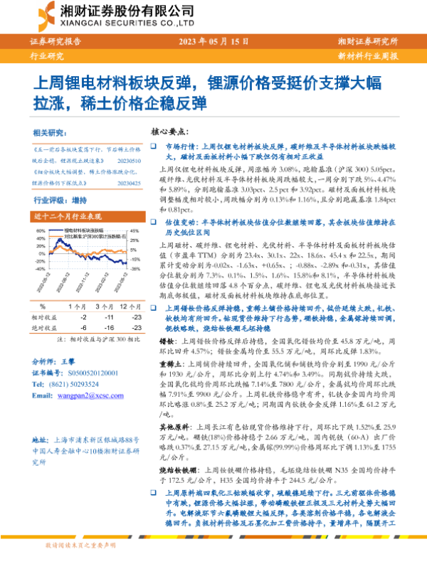 【湘财证券】【20230515】20230515-湘财证券-新材料行业周报:上周锂电材料板块反弹,锂源价格受挺价支撑大幅拉涨,稀土价格企稳反弹-12页