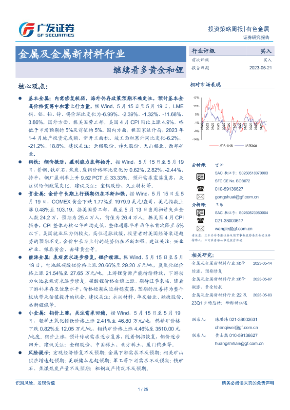 【广发证券】【20230521】20230521-广发证券-金属及金属新材料行业投资策略周报:继续看多黄金和锂-25页