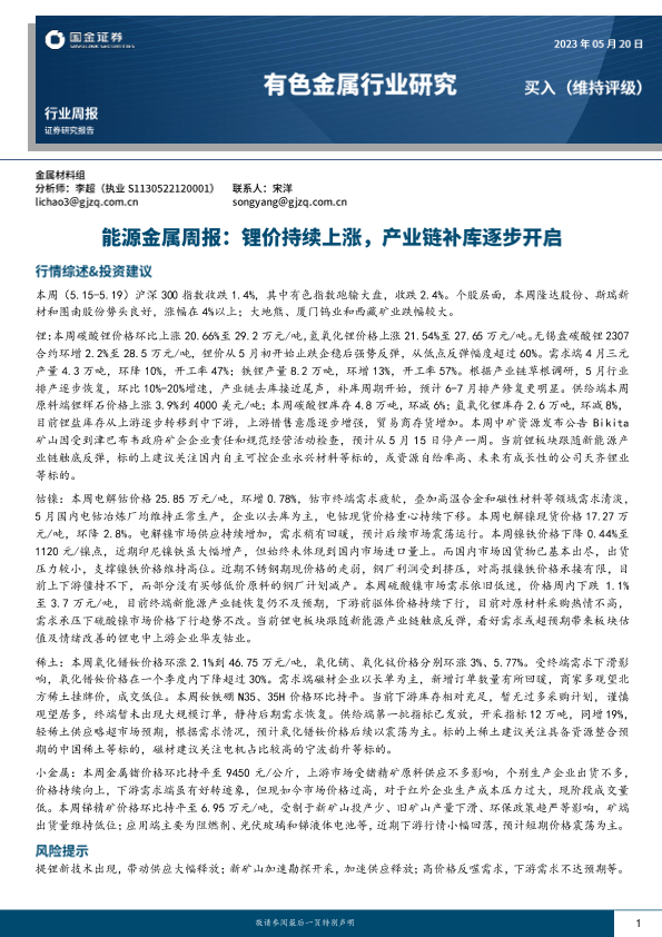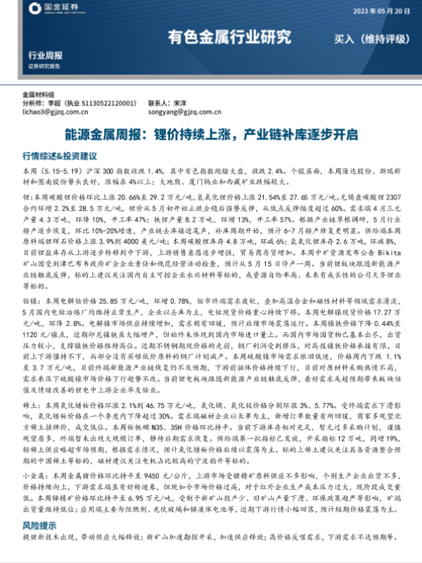 【国金证券】【20230520】20230520-国金证券-能源金属周报:锂价持续上涨,产业链补库逐步开启-16页