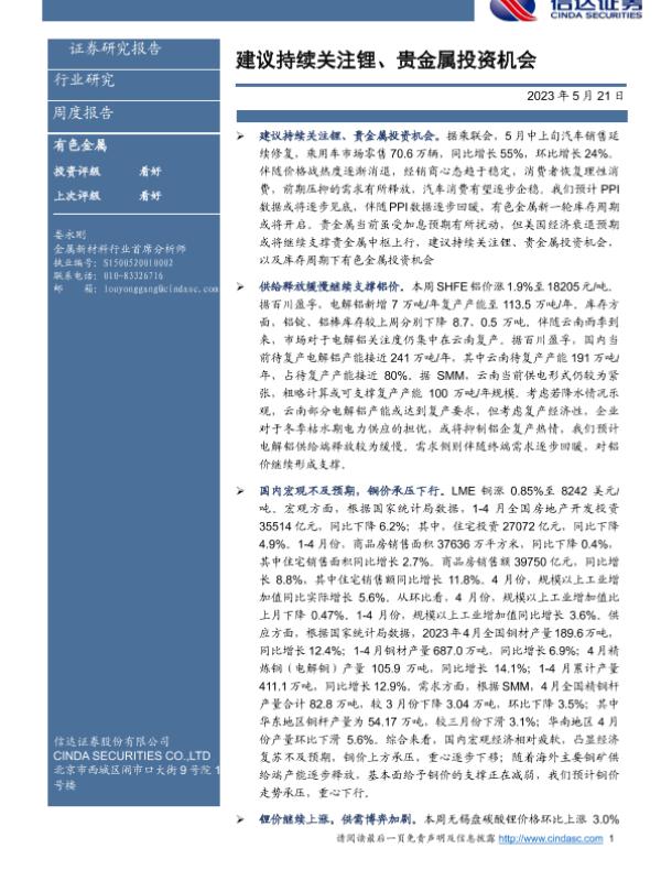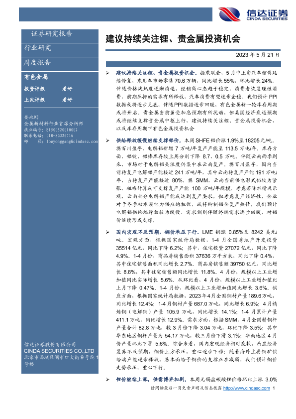 【信达证券】【20230521】20230521-信达证券-有色金属行业周度报告:建议持续关注锂、贵金属投资机会-12页