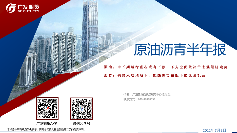 【广发期货】【20220702】沥青半年报:原油,中长期运行重心或有下移,下方空间取决于宏观经济走势,沥青,供需双增预期下,把握供需错配下的交易机会-56页