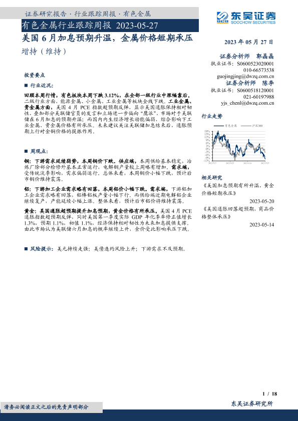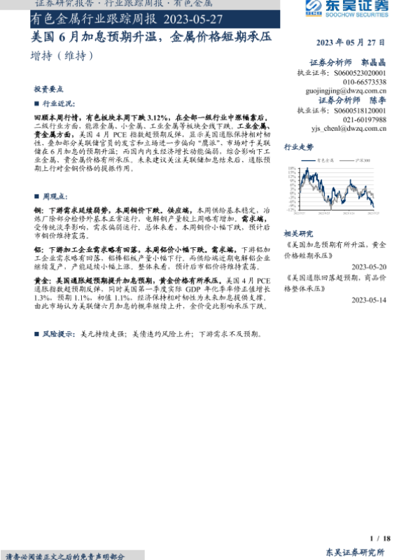 【东吴证券】【20230527】20230527-东吴证券-有色金属行业跟踪周报:美国6月加息预期升温,金属价格短期承压-18页