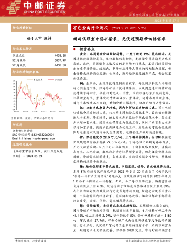 【中邮证券】【20230527】20230527-中邮证券-有色金属行业周报:缅甸佤邦重申锡矿禁采,光伏超预期带动锑需求-14页