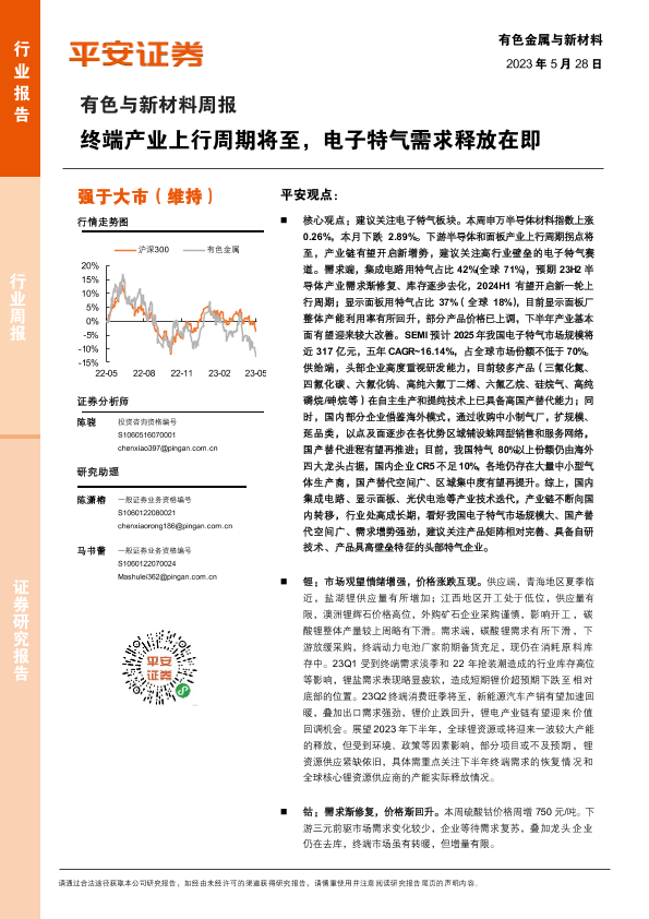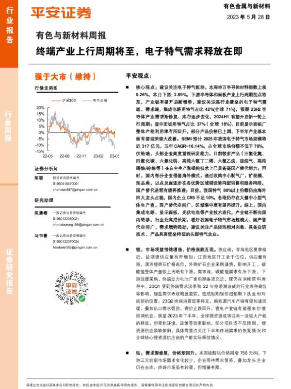 【平安证券】【20230528】20230528-平安证券-有色与新材料周报:终端产业上行周期将至,电子特气需求释放在即-16页