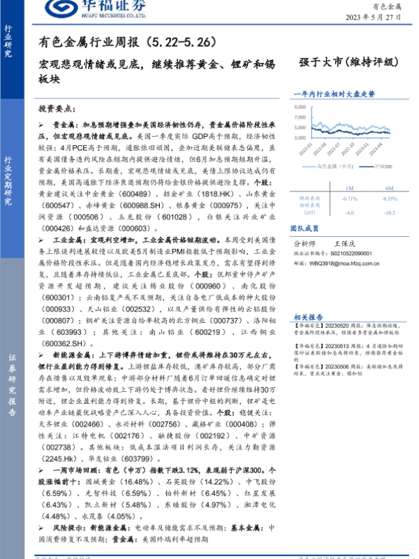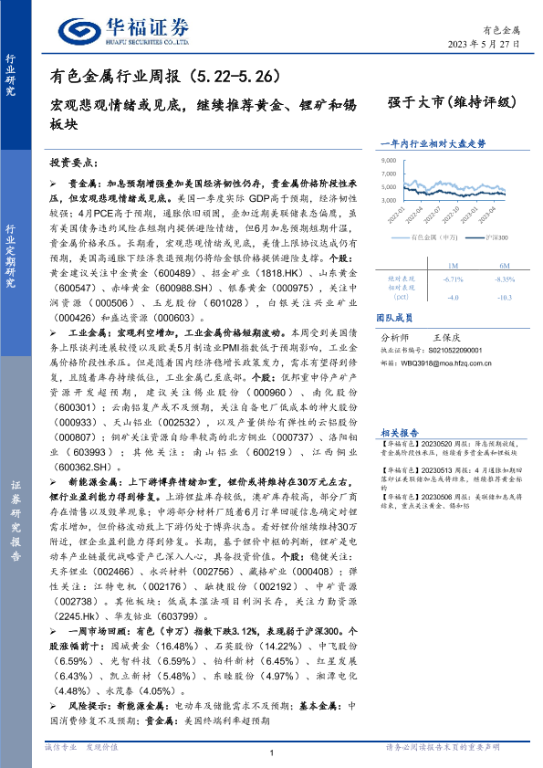 【华福证券】【20230527】20230527-华福证券-有色金属行业周报:宏观悲观情绪或见底,继续推荐黄金、锂矿和锡板块-15页