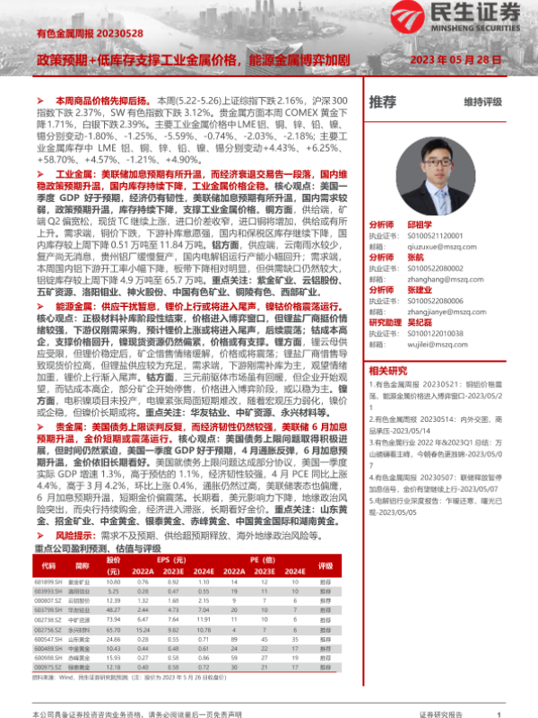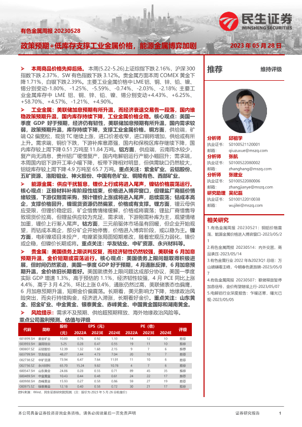 【民生证券】【20230528】20230528-民生证券-有色金属周报:政策预期+低库存支撑工业金属价格,能源金属博弈加剧-26页