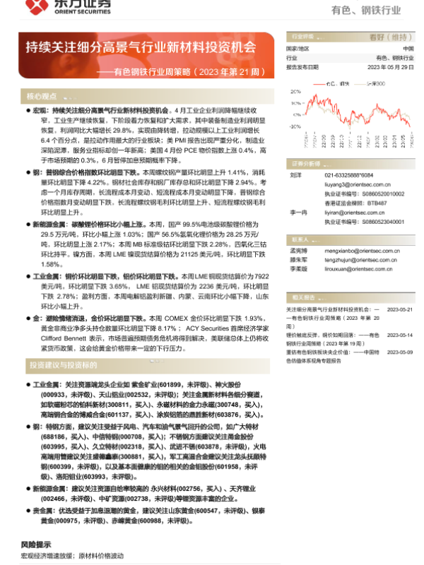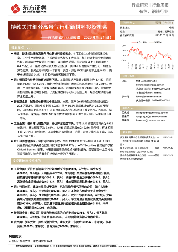 【东方证券】【20230529】20230529-东方证券-有色钢铁行业周策略(2023年第21周):持续关注细分高景气行业新材料投资机会-39页