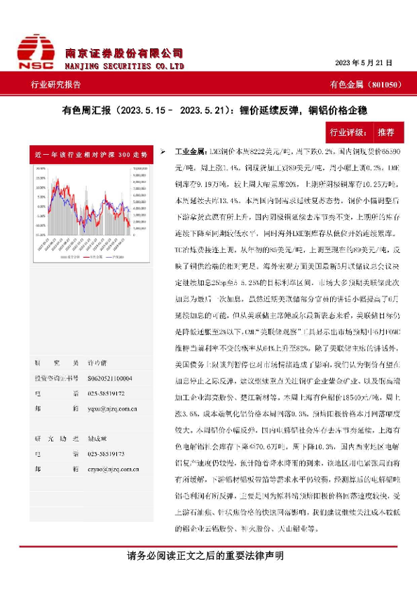 【南京证券】【20230521】20230521-南京证券-有色周汇报:锂价延续反弹,铜铝价格企稳-10页