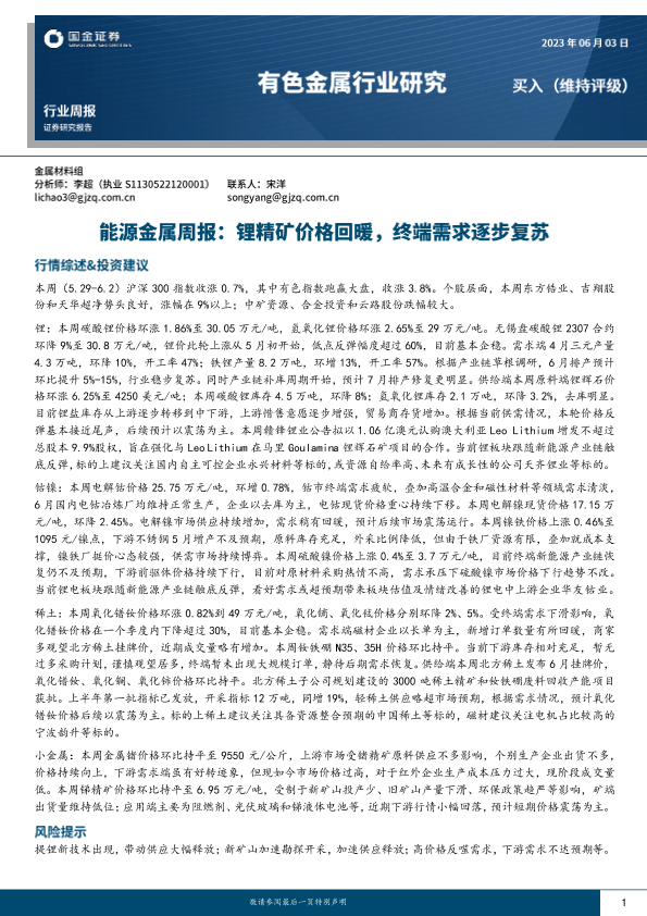 【国金证券】【20230603】20230603-国金证券-能源金属周报:锂精矿价格回暖,终端需求逐步复苏-16页