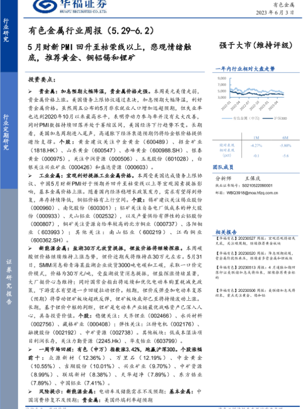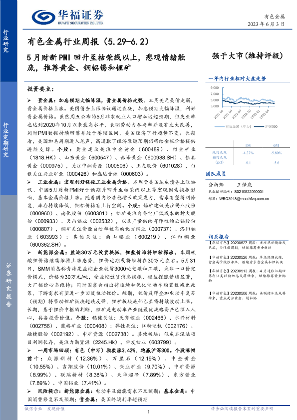 【华福证券】【20230603】20230603-华福证券-有色金属行业周报:5月财新PMI回升至枯荣线以上,悲观情绪触底,推荐黄金、铜铝锡和锂矿-15页