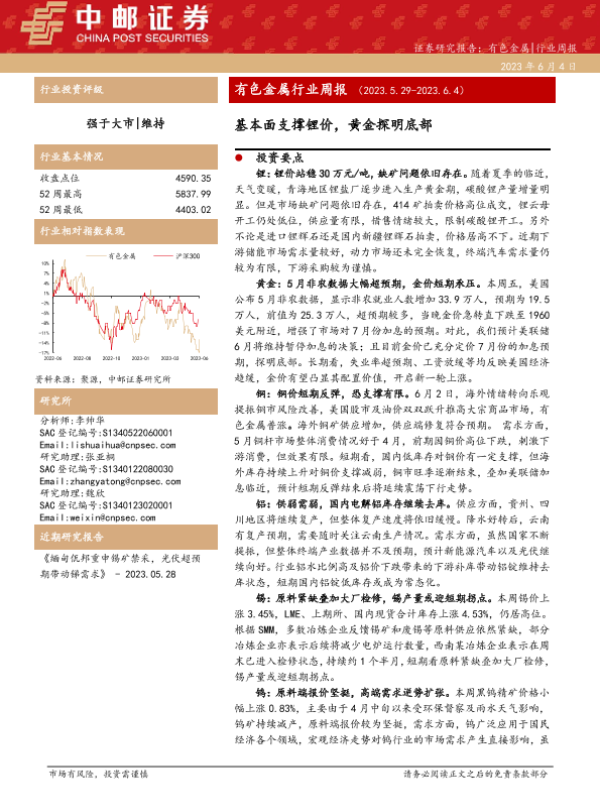 【中邮证券】【20230604】20230604-中邮证券-有色金属行业周报:基本面支撑锂价,黄金探明底部-15页