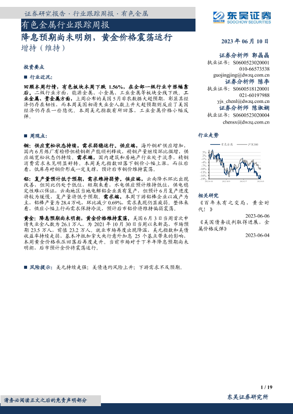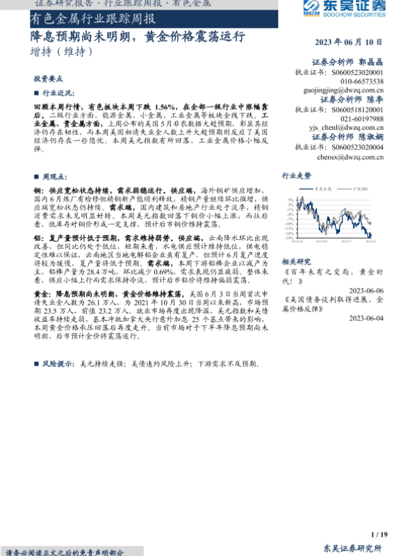 【东吴证券】【20230610】20230610-东吴证券-有色金属行业跟踪周报:降息预期尚未明朗,黄金价格震荡运行-19页