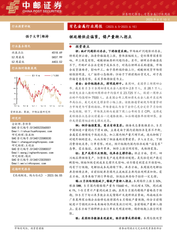【中邮证券】【20230610】20230610-中邮证券-有色金属行业周报:锂延续供应偏紧,锡产量渐入拐点-15页