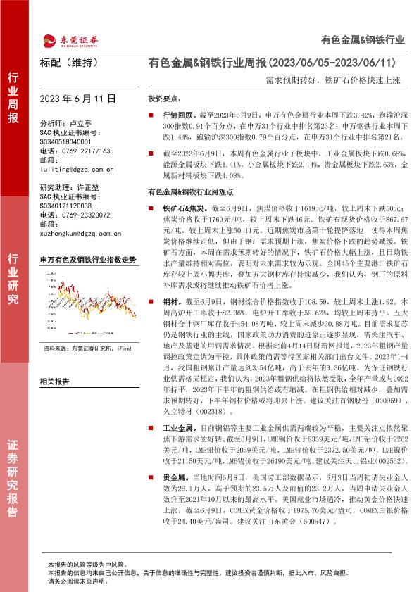【东莞证券】【20230611】20230611-东莞证券-有色金属&钢铁行业周报:需求预期转好,铁矿石价格快速上涨-17页