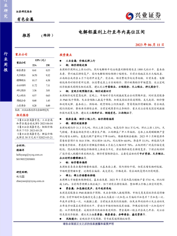 【兴业证券】【20230611】20230611-兴业证券-有色金属行业周报:电解铝盈利上行至年内高位区间-21页