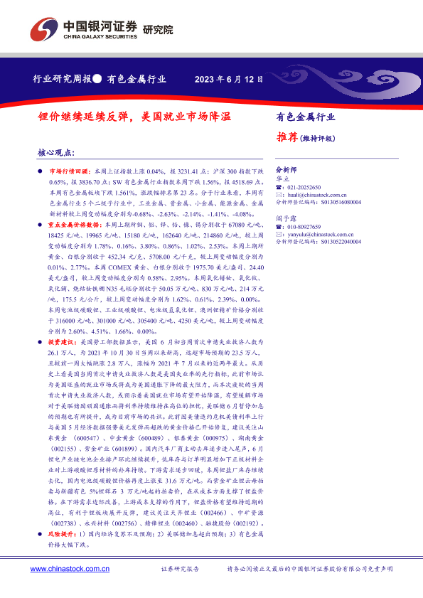 【银河证券】【20230612】20230612-中国银河-有色金属行业行业研究周报:锂价继续延续反弹,美国就业市场降温-18页