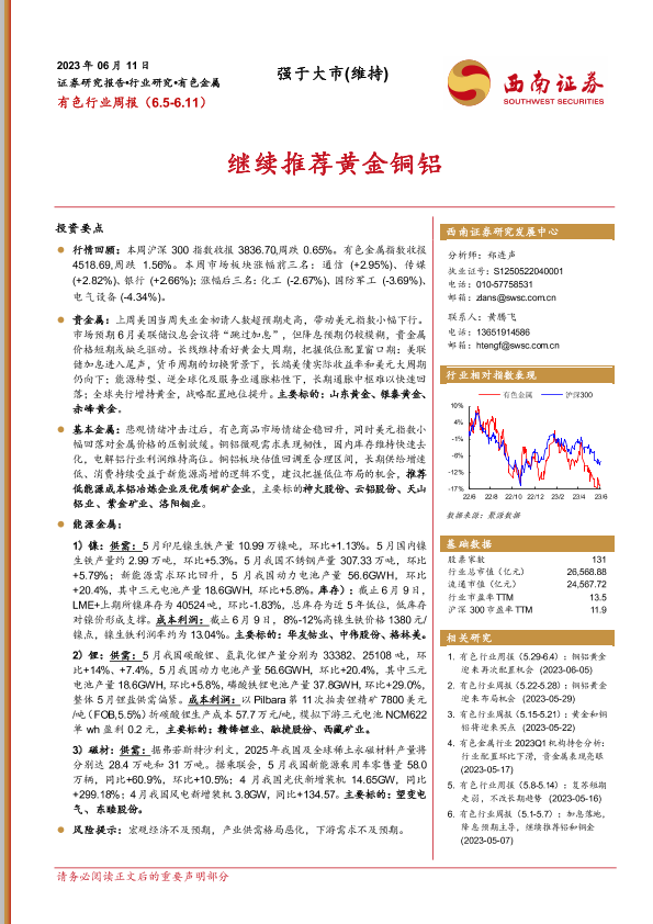 【西南证券】【20230611】20230611-西南证券-有色行业周报:继续推荐黄金铜铝-23页