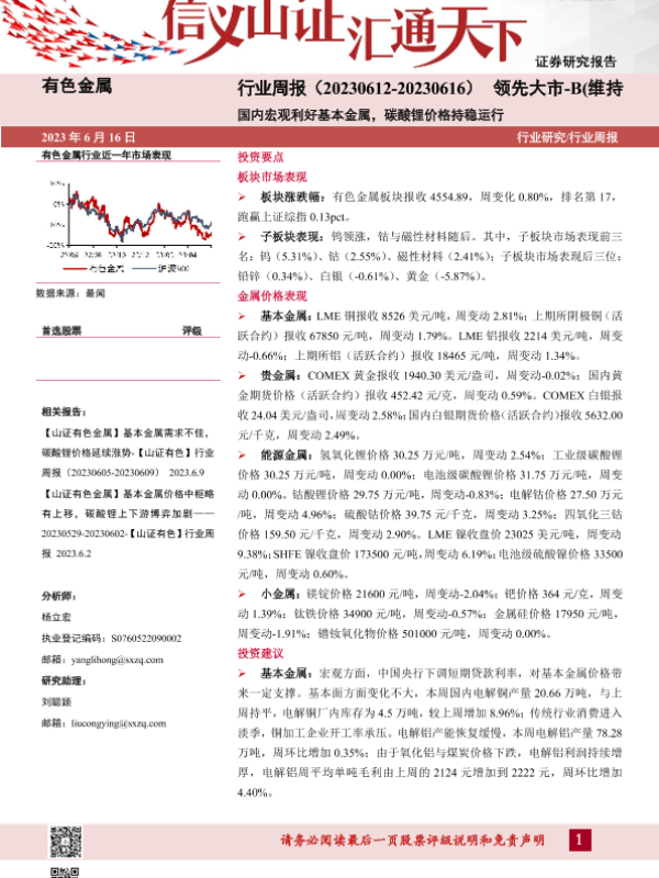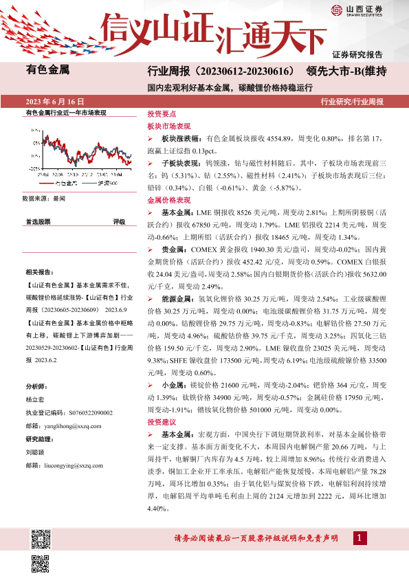 【山西证券】【20230616】20230616-山西证券-有色金属行业周报:国内宏观利好基本金属,碳酸锂价格持稳运行-19页