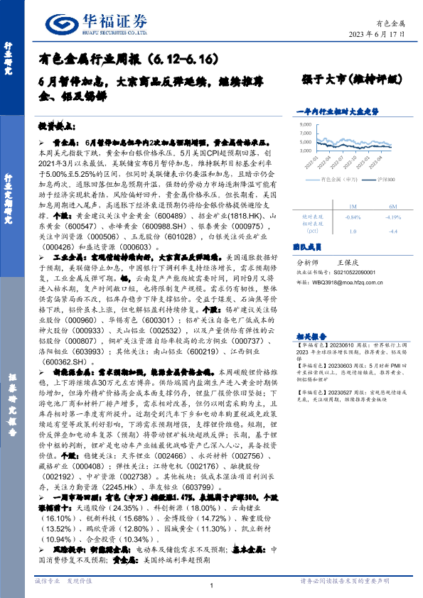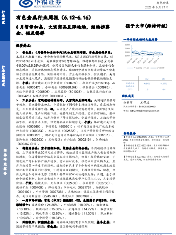 【华福证券】【20230617】20230617-华福证券-有色金属行业周报:6月暂停加息,大宗商品反弹延续,继续推荐金、铝及锡锑-16页
