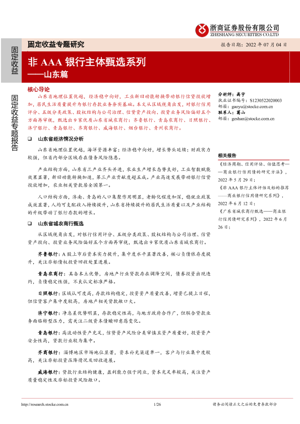 【浙商证券】【20220704】固定收益专题研究:非AAA银行主体甄选系列,山东篇-26页