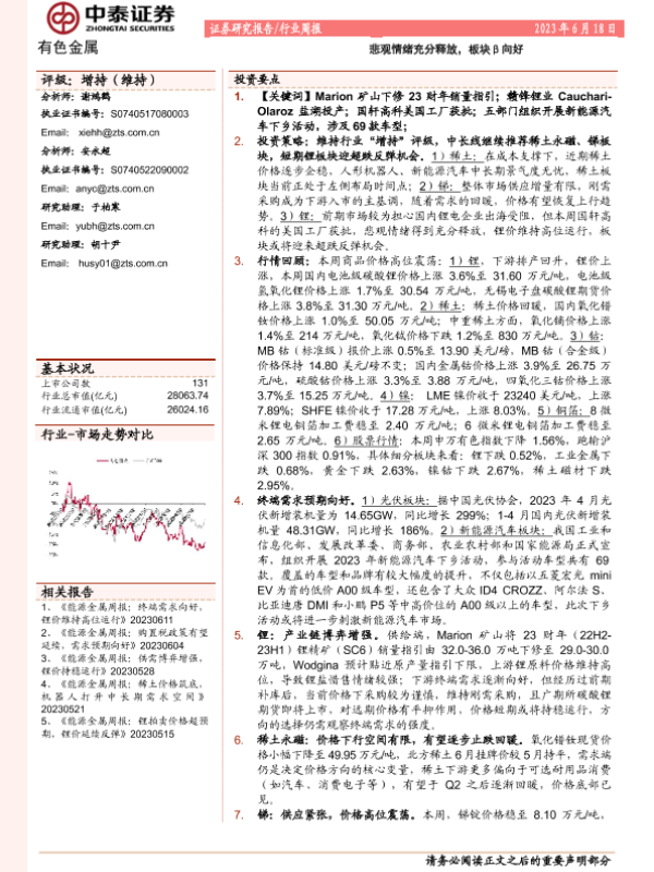 【中泰证券】【20230618】20230618-中泰证券-有色金属行业周报:悲观情绪充分释放,板块β向好-22页
