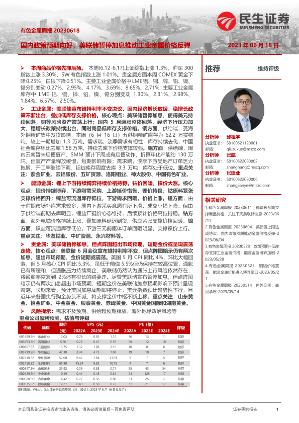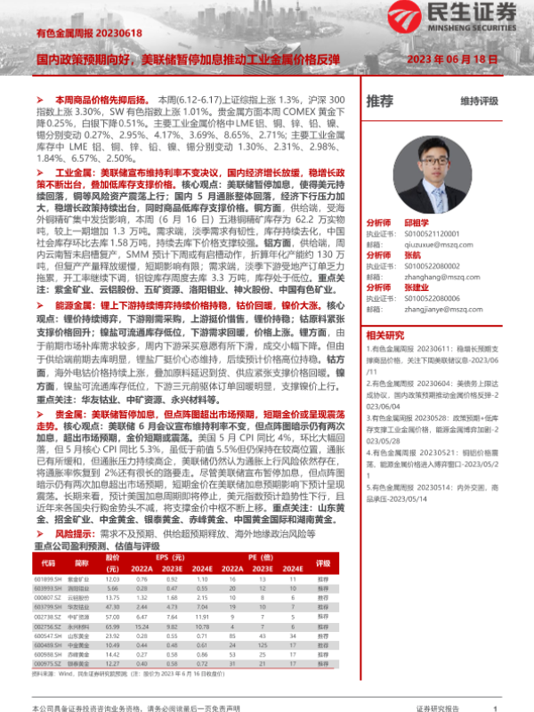 【民生证券】【20230618】20230618-民生证券-有色金属周报:国内政策预期向好,美联储暂停加息推动工业金属价格反弹-25页
