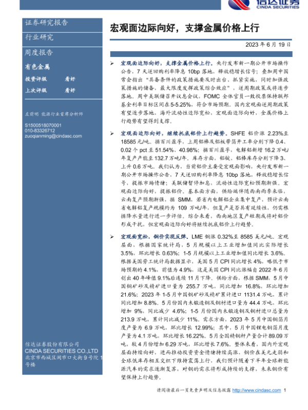 【信达证券】【20230619】20230619-信达证券-有色金属周度报告:宏观面边际向好,支撑金属价格上行-12页