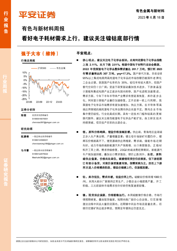 【平安证券】【20230618】20230618-平安证券-有色与新材料周报:看好电子耗材需求上行,建议关注镍钴底部行情-16页