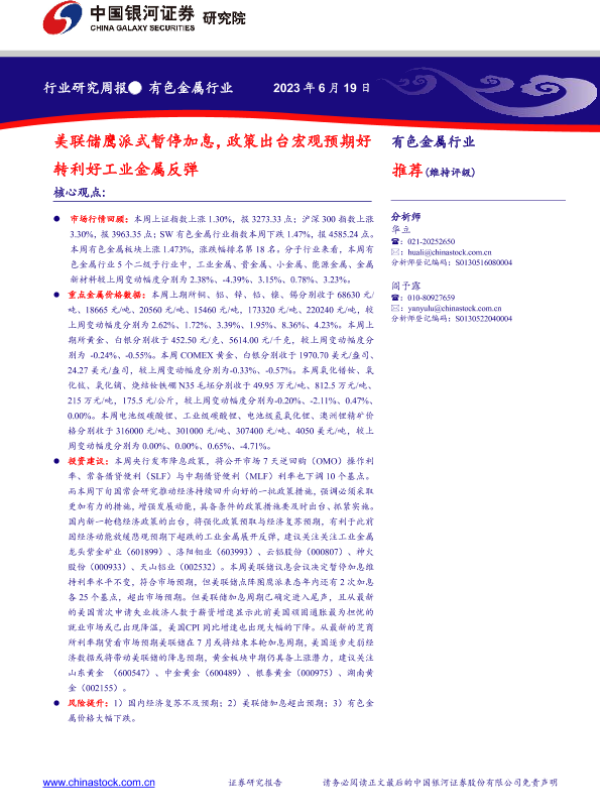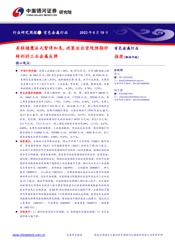 【银河证券】【20230619】20230619-中国银河-有色金属行业研究周报:美联储鹰派式暂停加息,政策出台宏观预期好转利好工业金属反弹-19页