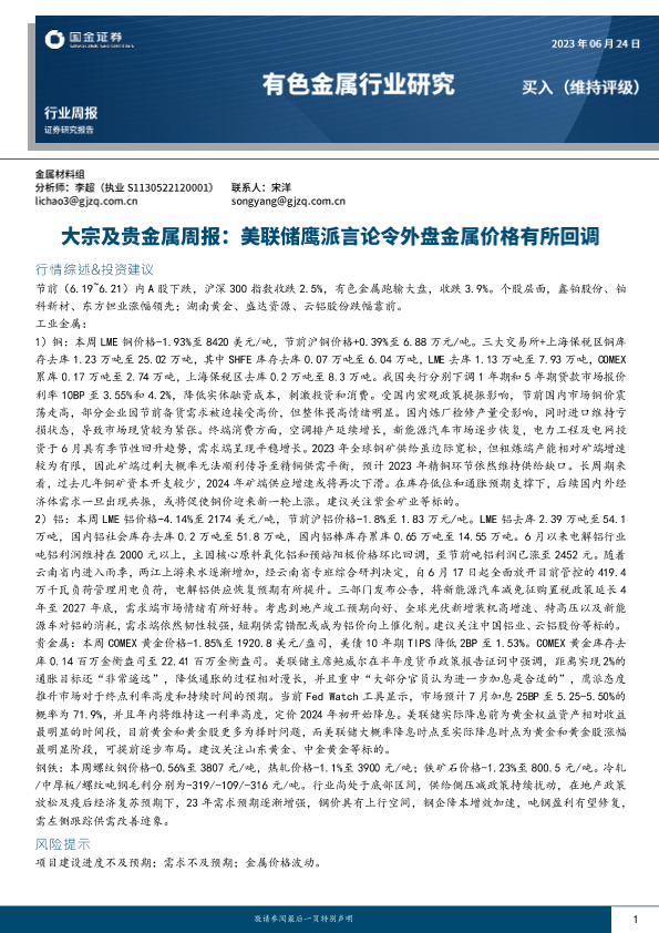 【国金证券】【20230624】20230624-国金证券-有色金属行业研究:大宗及贵金属周报:美联储鹰派言论令外盘金属价格有所回调-13页
