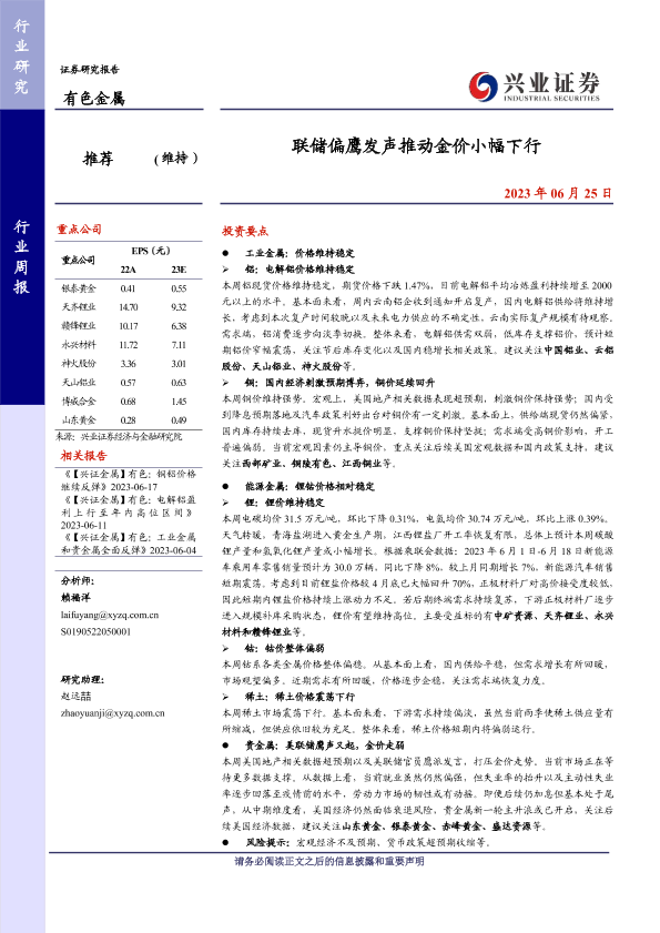 【兴业证券】【20230625】20230625-兴业证券-有色金属行业周报:联储偏鹰发声推动金价小幅下行-20页