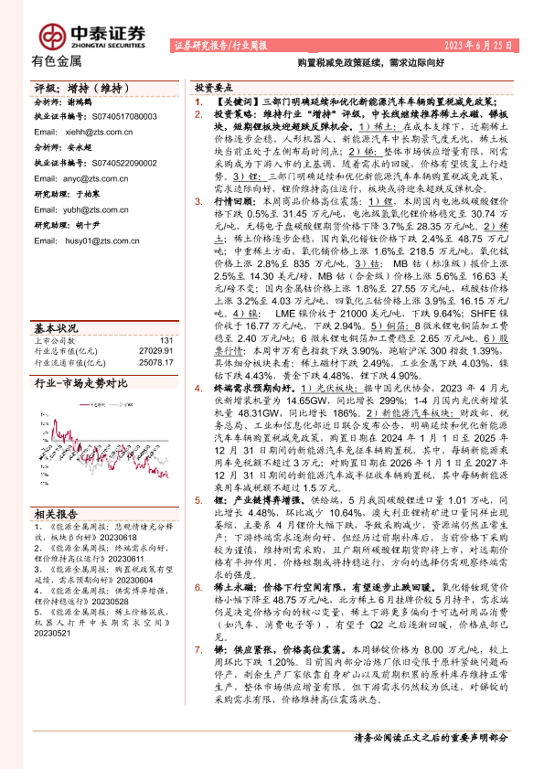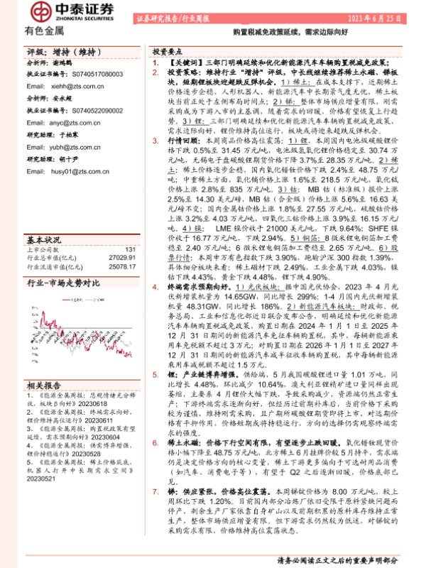 【中泰证券】【20230625】20230625-中泰证券-有色金属行业周报:购置税减免政策延续,需求边际向好-21页