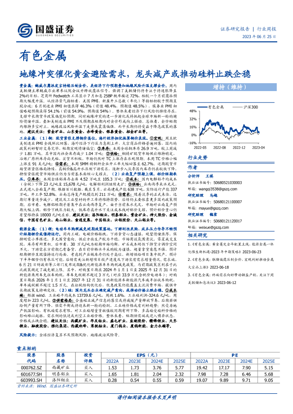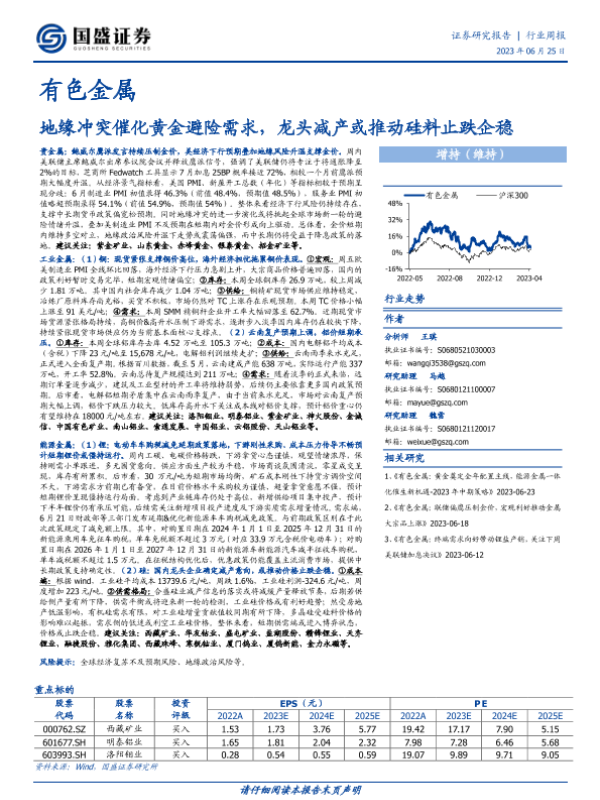 【国盛证券】【20230625】20230625-国盛证券-有色金属行业周报:地缘冲突催化黄金避险需求,龙头减产或推动硅料止跌企稳-34页
