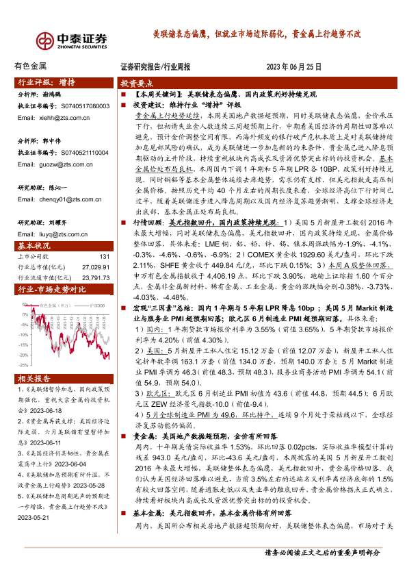 【中泰证券】【20230625】20230625-中泰证券-有色金属行业周报:美联储表态偏鹰,但就业市场边际弱化,贵金属上行趋势不改-33页