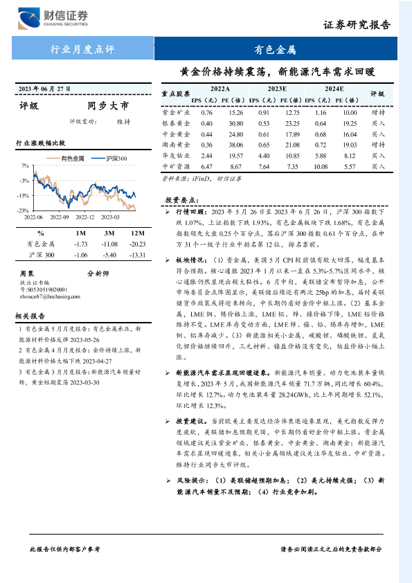 【财信证券】【20230627】20230627-财信证券-有色金属行业月度点评:黄金价格持续震荡,新能源汽车需求回暖-17页