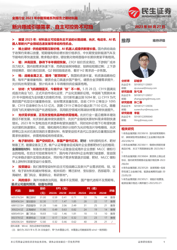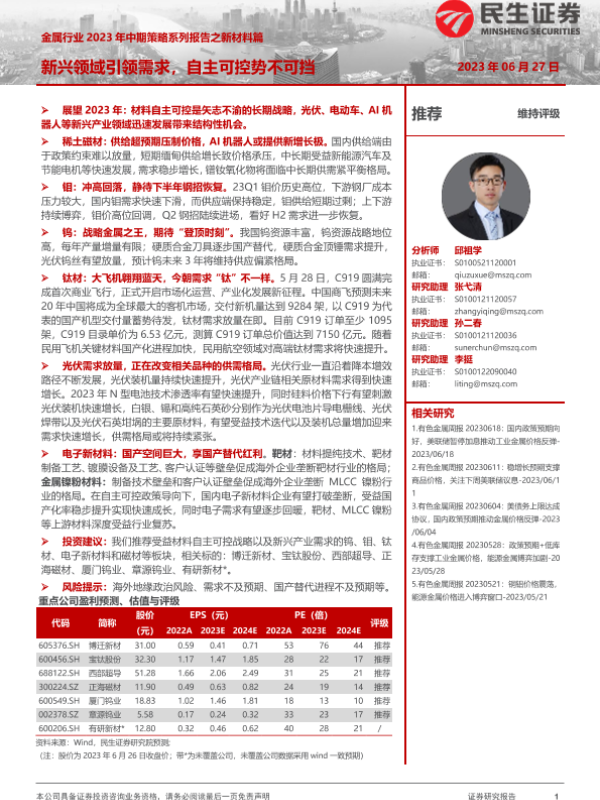 【民生证券】【20230627】金属行业2023年中期策略系列报告之新材料篇:新兴领域引领需求,自主可控势不可挡-107页