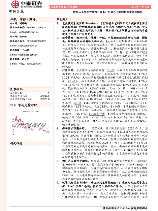 【中泰证券】【20230702】20230702-中泰证券-有色金属行业周报:世界人工智能大会召开在即,机器人上游材料有望再迎催化-22页