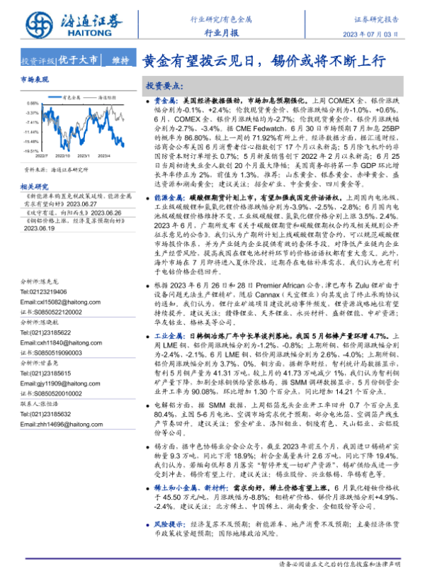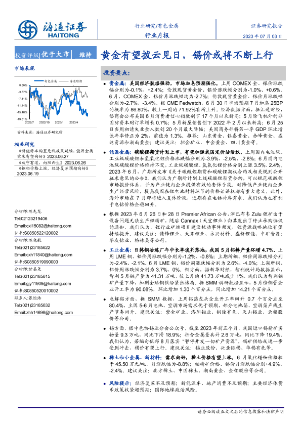 【海通证券】【20230703】20230703-海通证券-有色金属行业月报:黄金有望拨云见日,锡价或将不断上行-14页