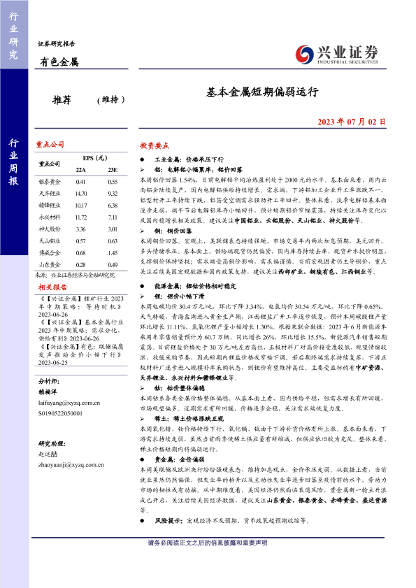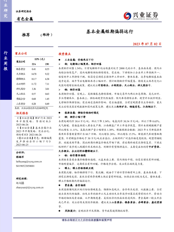 【兴业证券】【20230702】20230702-兴业证券-有色金属行业周报:基本金属短期偏弱运行-21页