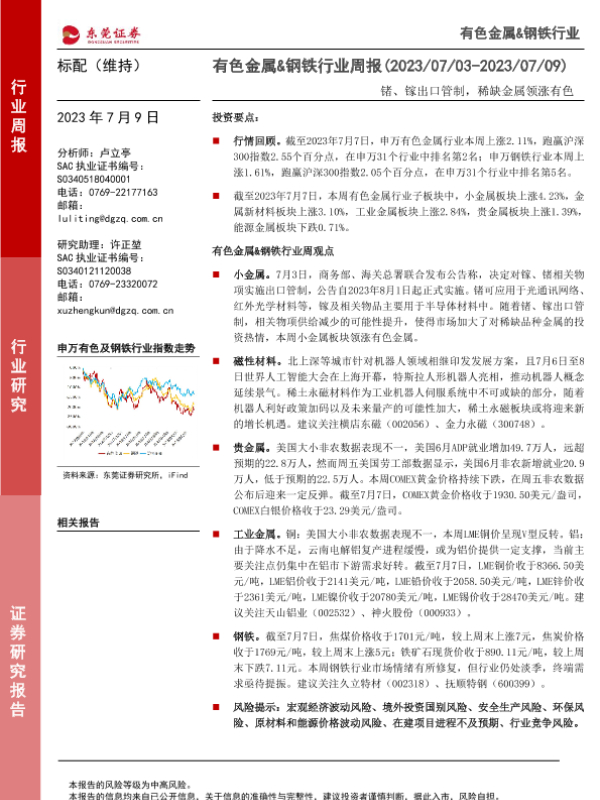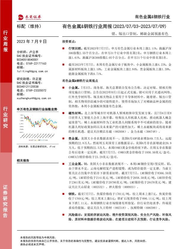 【东莞证券】【20230709】20230709-东莞证券-有色金属&钢铁行业周报:锗、镓出口管制,稀缺金属领涨有色-14页
