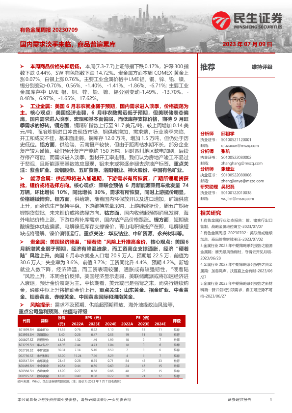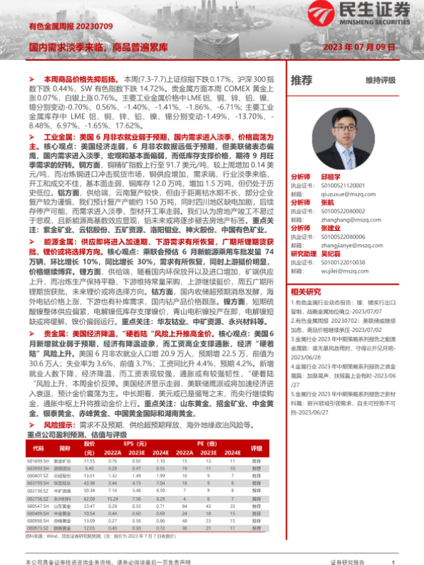 【民生证券】【20230709】20230709-民生证券-有色金属周报:国内需求淡季来临,商品普遍累库-25页
