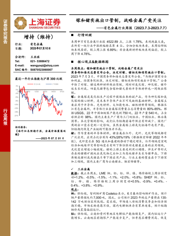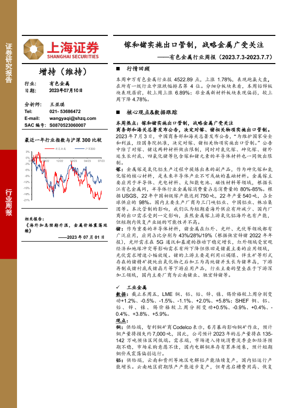 【上海证券】【20230710】20230710-上海证券-有色金属行业周报:镓和锗实施出口管制,战略金属广受关注-17页