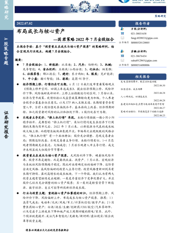 【国泰君安证券】【20220702】国君策略2022年7月金股组合:布局成长与核心资产-23页