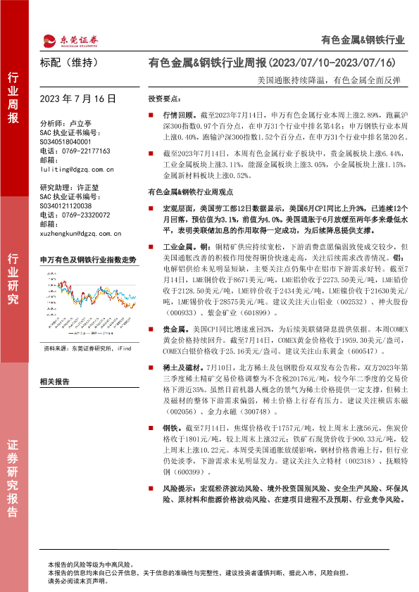 【东莞证券】【20230716】20230716-东莞证券-有色金属&钢铁行业周报:美国通胀持续降温,有色金属全面反弹-14页