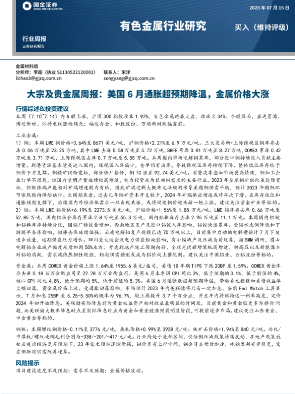 【国金证券】【20230715】20230715-国金证券-有色金属行业研究:大宗及贵金属周报:美国6月通胀超预期降温,金属价格大涨-13页